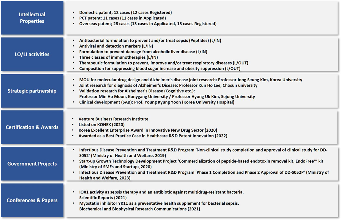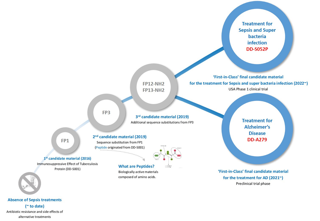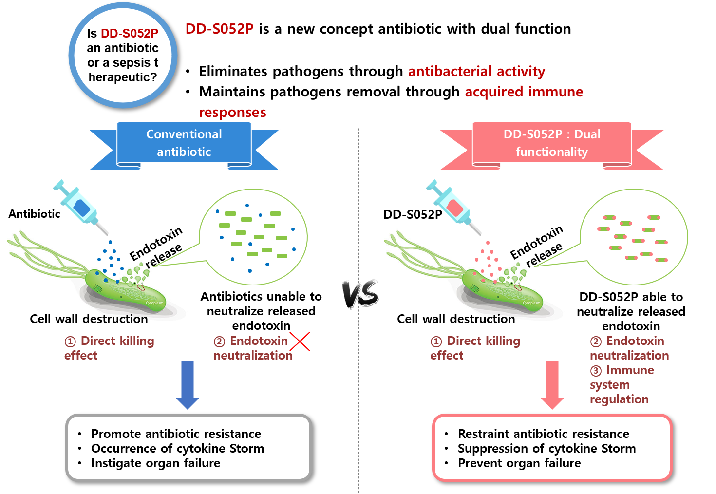 With its low toxicity and potent mode of action, "DD-S052P" is a promising candidate in the treatment of endotoxin-releasing gram negative bacterial infections and multidrug-resistant superbacteria infections, both of which are serious public health issues.
